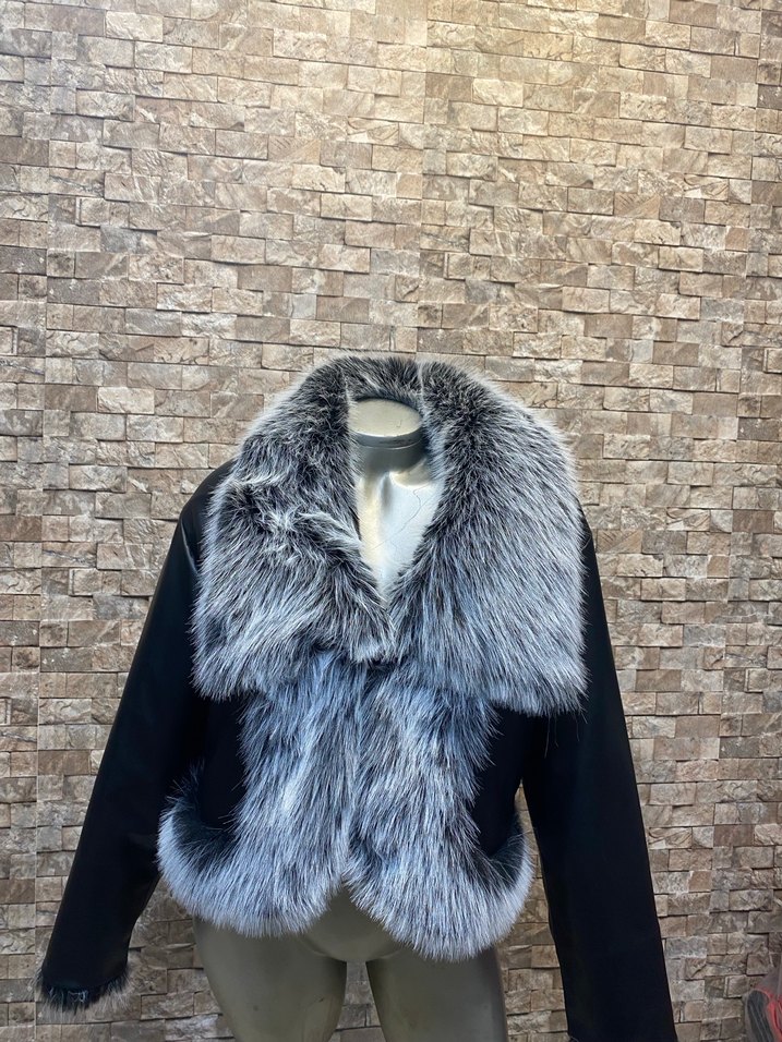 Çift taraflı, kısa ve dar kesim kadın ceket. Uzun kollu, kürk detaylı yakası ve etek ucu ile gündelik kullanıma uygun.