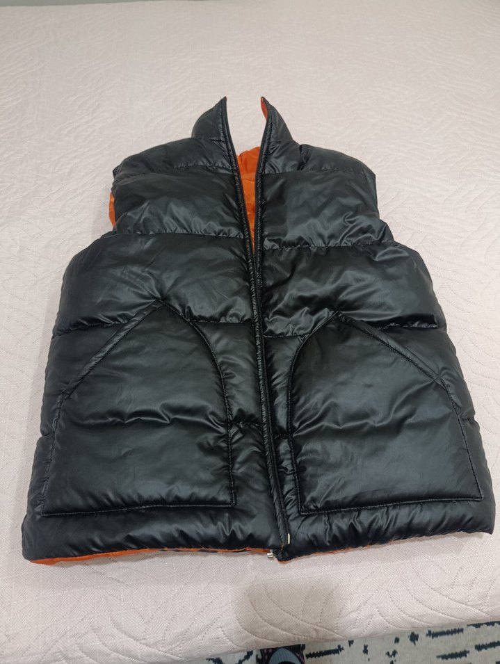 Siyah renkli, fermuarlı ve yüksek yakalı erkek yelek. İnce kesimi ve yumuşak, sıcak kumaşıyla günlük kullanıma uygun. xl bedenekadar olur puf puf 2 defa giyildi marka temsili