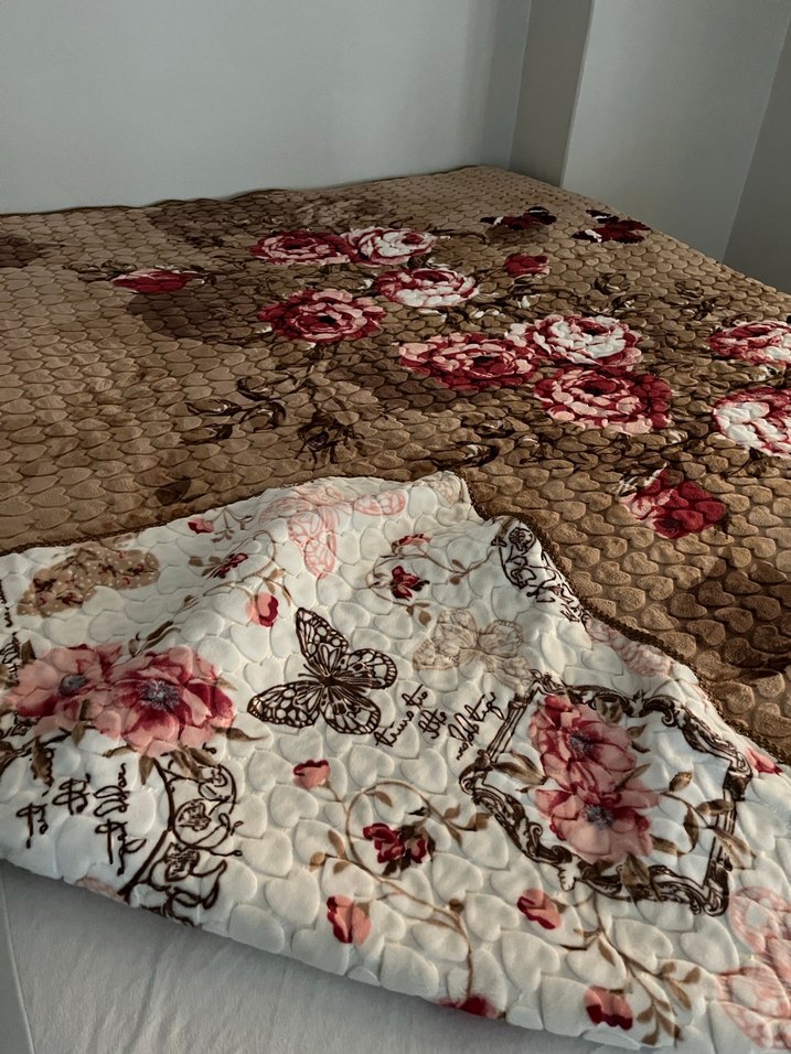Koyu kahverengi zemin üzerine kırmızı ve pembe çiçek desenleri bulunan yatak örtüsü. Ters yüzü krem rengi, çiçek ve kelebek motifleri içerir.