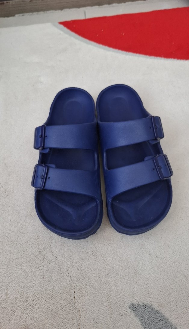 Lacivert renkli, kauçuk malzemeden yapılmış, çift tokalı ayarlanabilir erkek terliği. Düz ve desensiz tasarım.