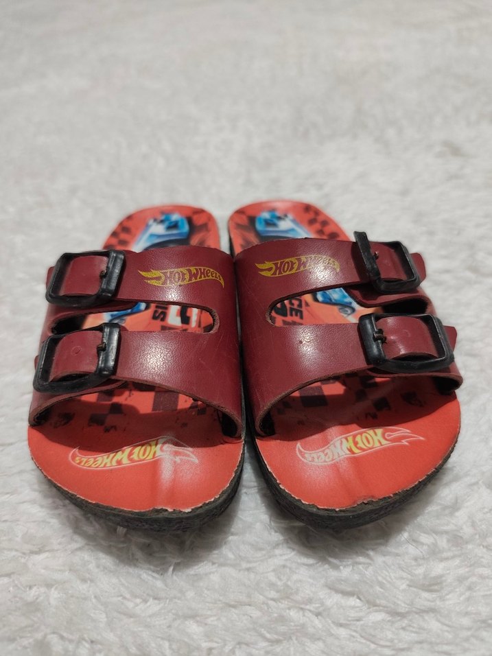 Lastik malzemeden yapılmış, ayarlanabilir tokalı çift kayışlı, renkli baskılı tabanlı kırmızı Hot Wheels erkek terliği.