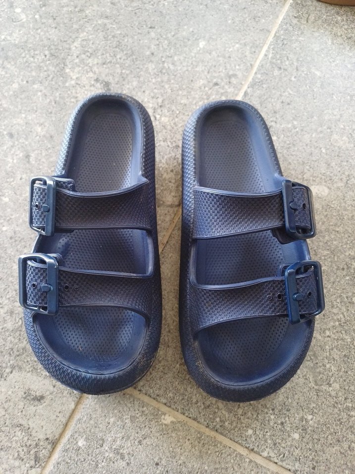 Lacivert renkte, kauçuk malzemeden yapılmış, çift tokalı erkek terlik. Düz ve sade tasarıma sahip, günlük kullanıma uygun.