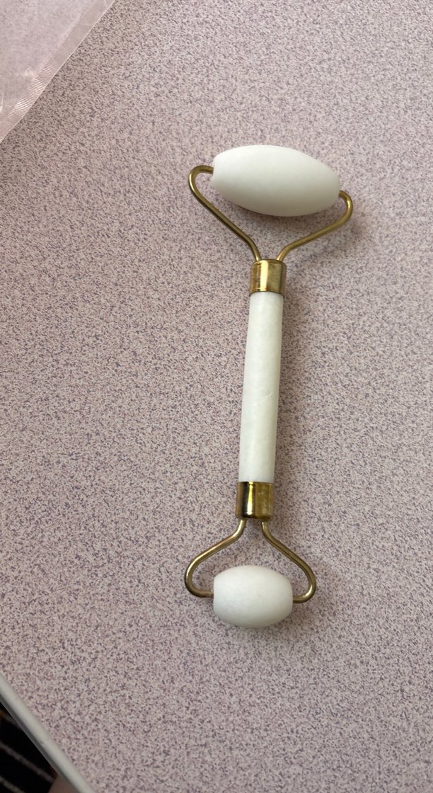 Çift uçlu beyaz yüz masaj taşı, pürüzsüz taşlar ve altın renkli metal detaylarla cildi rahatlatır ve canlandırır.