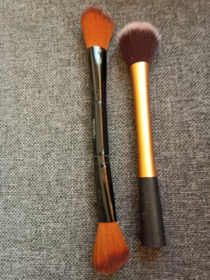 Yumuşak kıllara sahip, biri çift uçlu gri saplı, diğeri kahverengi saplı iki makyaj fırçası. ️2 adettir