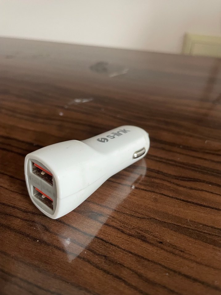 Çift USB portlu beyaz araç şarj cihazı, cihazlarınızı hareket halindeyken şarj etmek için uygundur. Kompakt ve kullanışlıdır.