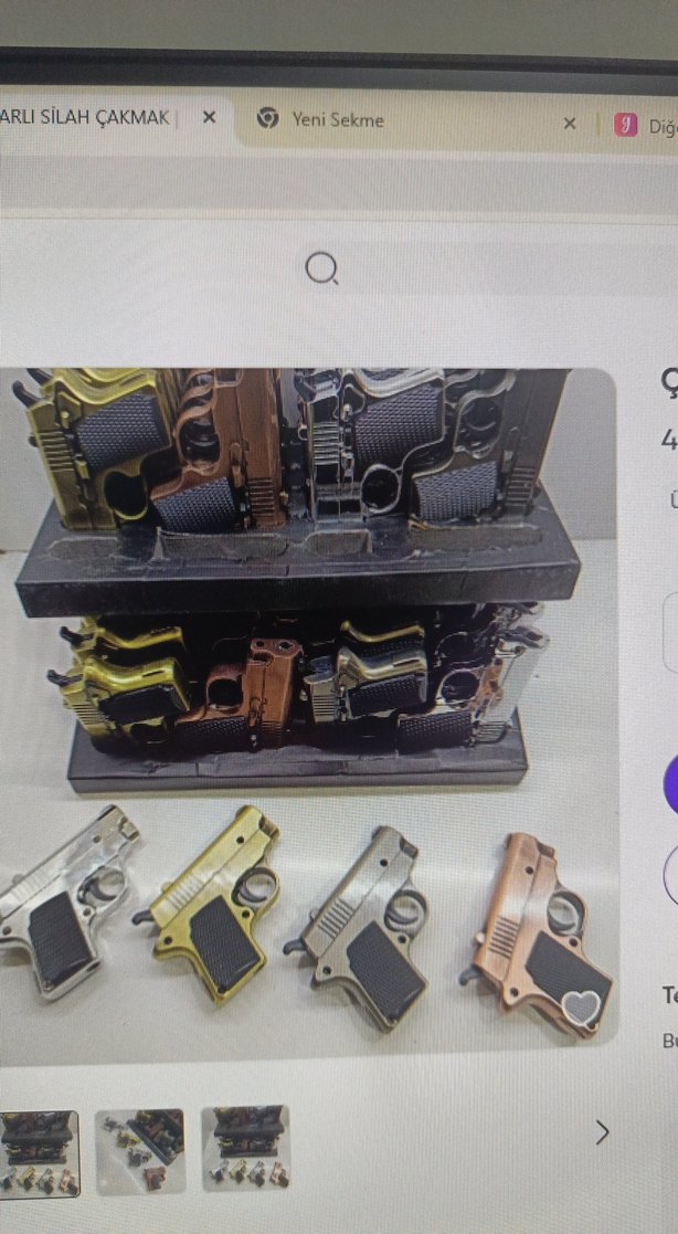 Çeşitli koyu ve metalik renklerde küçük oyuncak tabancalar figürlü çakmak siyah standa yerleştirilmiş. Her tabancanın detaylı sap ve tetik tasarımı bulunur. cift yanarli