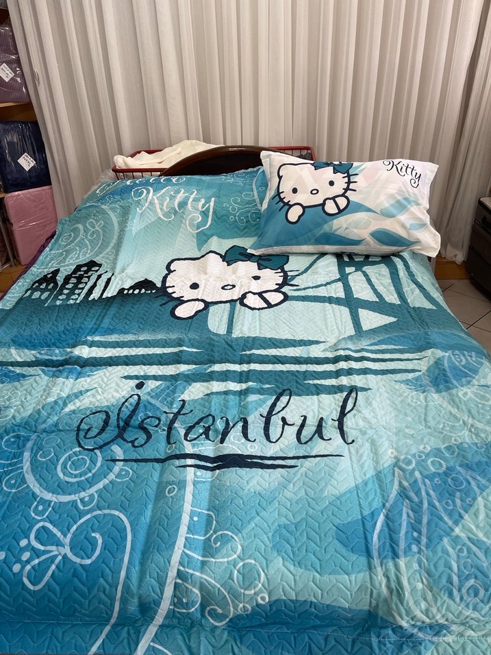 Pastel mavi renkli, Hello Kitty ve İstanbul temalı baskılı yatak örtüsü ve uyumlu yastık kılıfı. 4 mevsim özelliklidir içine yorgan girer. Kapitone tiplidir harika bir kalitedir #yatakörtüsü #nevresimtakımı #pike