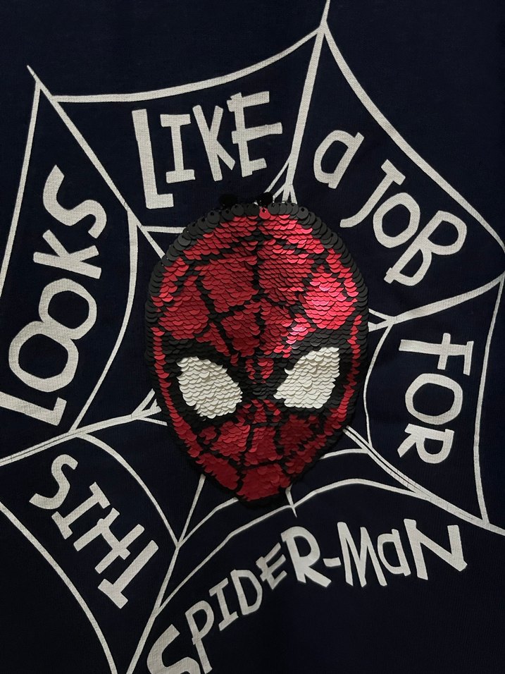Koyu renkli, çok renkli çift yönlü payetli Spider-Man yüzü ve örümcek ağı ile yazılı rozettir. Rock punk havası için uygun. ️