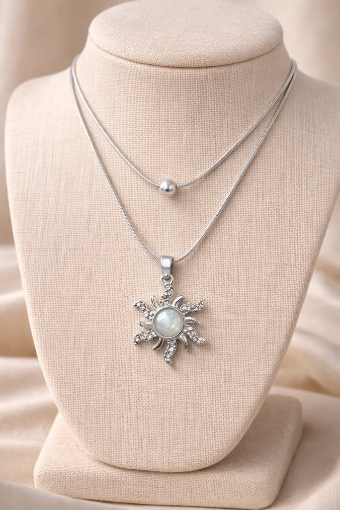 Güneş figürlü yuvarlak taşlı kolye, iki ince zincirden oluşur. Bohem ve minimal tarzıyla günlük kullanıma uygundur. ☀️