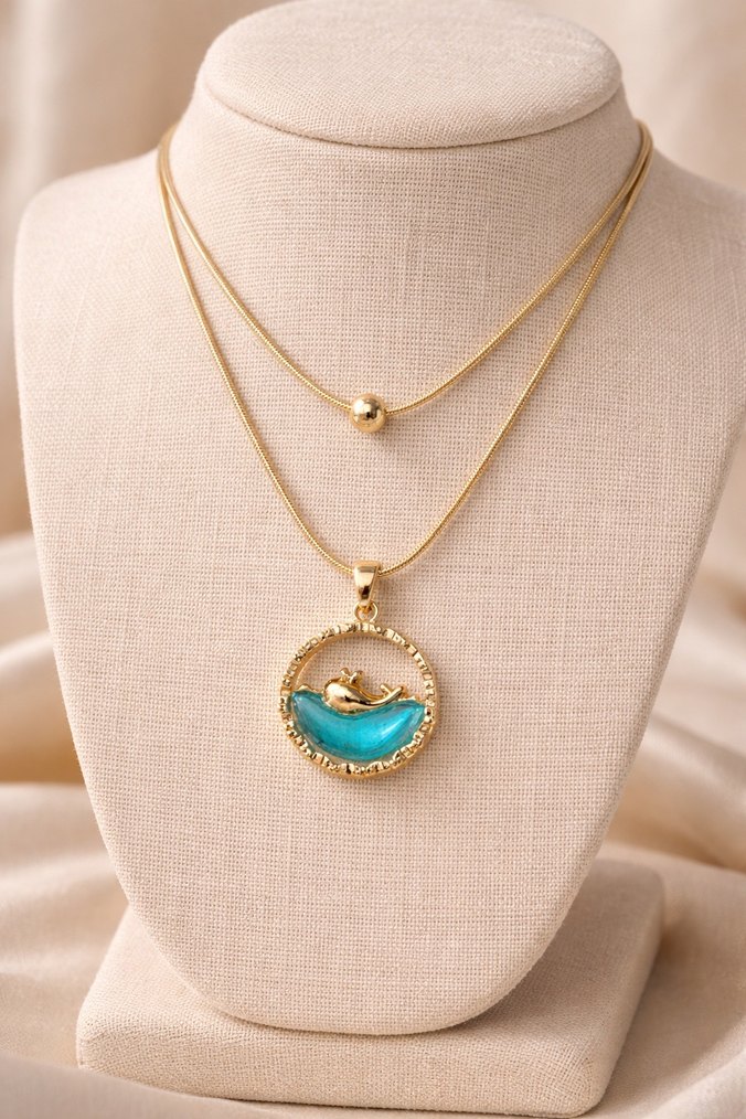 Çift Zincir Yunus Balığı Şans Kolyesi Gold