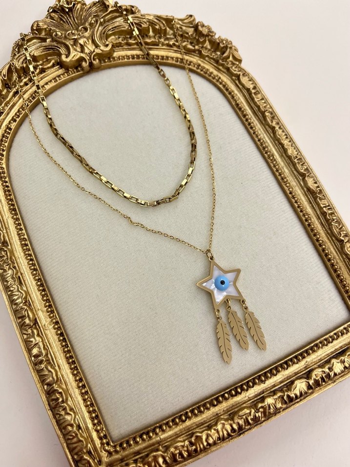 Uzun zincirli, detaylı zincir ve yıldız şeklinde işlemeli göz ile tüy figürlü bohem tarzda altın kolye.