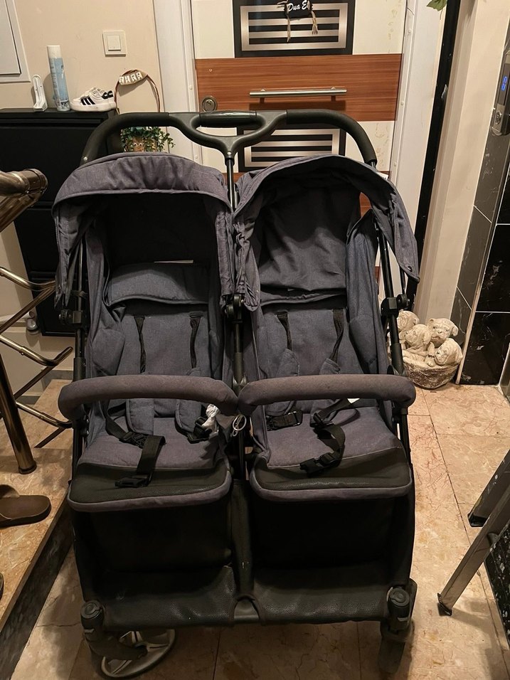 Gri renkli çiftli bebek arabasında sadece kemeri bulunur