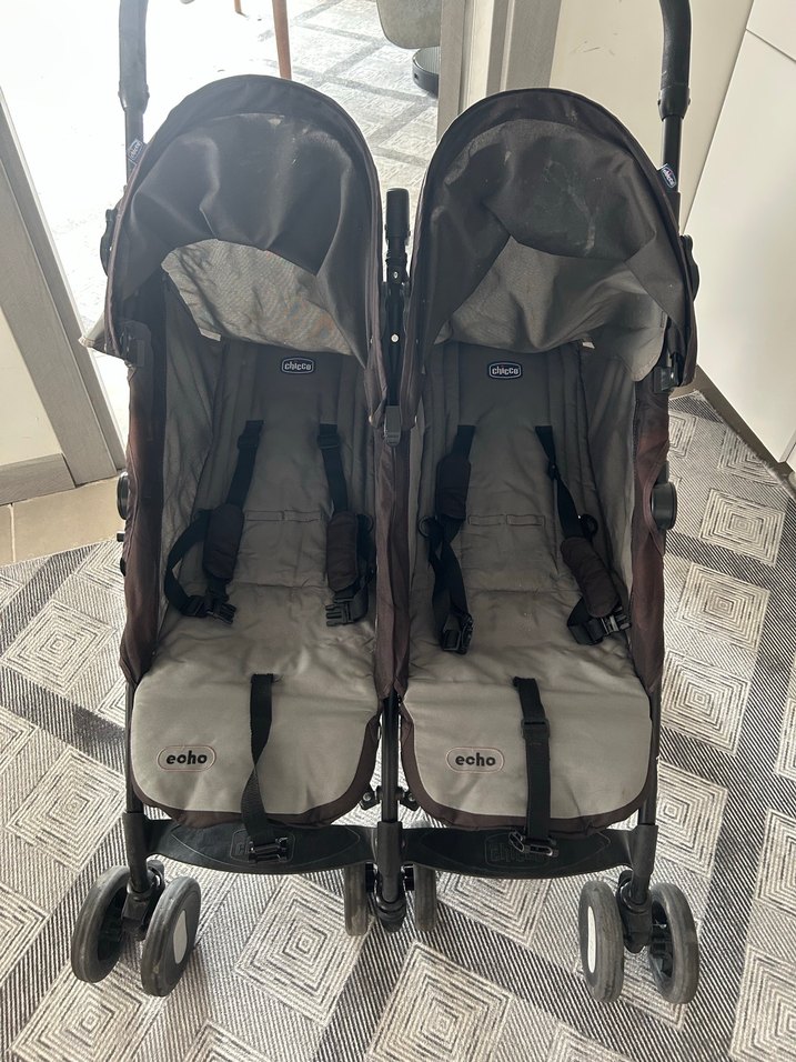 Kahverengi çerçeveli, gri oturma alanına sahip çiftli bebek arabası. Her koltukta emniyet kemeri ve tente bulunur. Hafif yapılıdır. 'echo' yazısı oturma alanında yer alır. Tutma yerinde hafif yırtık var.Kapanınca az yer kaplar yağmurluğu hediye olarak göndereceğim.