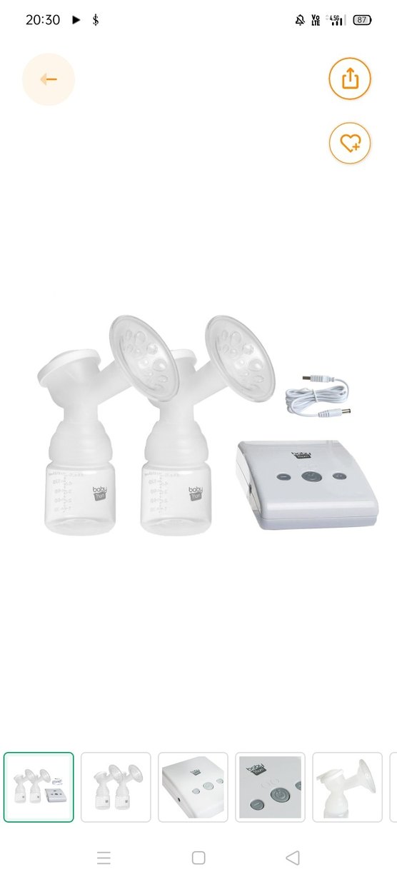 Beyaz renkli çiftli elektrikli göğüs pompası, iki süt toplama şişesi ve kullanımı kolay kontrol ünitesi içerir. Rahat süt sağımı sağlar.