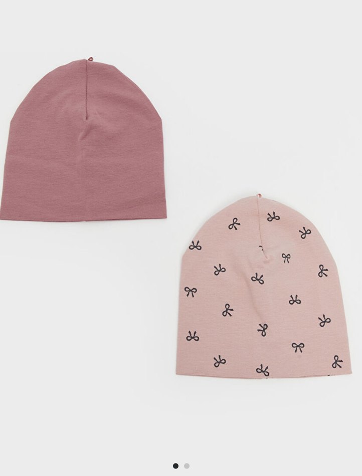 İki adet pembe tonlarında, birisi düz diğeri siyah fiyonk desenli, örme çocuk bere seti. &