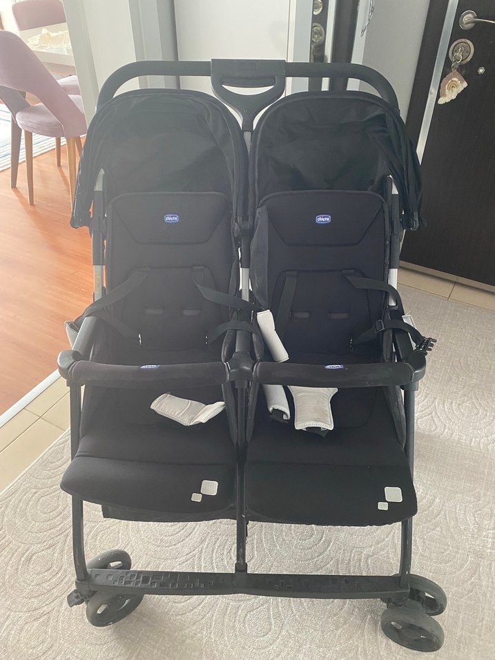 İki yan yana oturma yeri, güvenlik kemerleri ve ayarlanabilir tente özelliklerine sahip siyah çiftli bebek arabası.