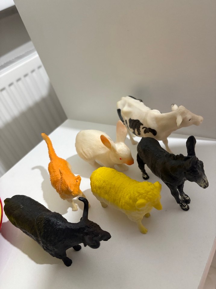Bu sette koyu ve beyaz tonlarda inek, tavşan, kedi, koyun ve iki boğa olmak üzere altı hayvan figürü bulunur.