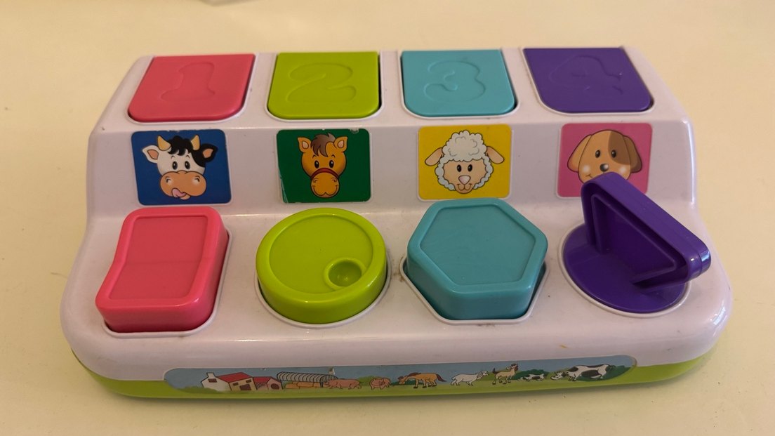 Çeşitli şekiller ve hayvan resimleri içeren renkli eğitici oyuncak, çocukların oyunla öğrenmesini sağlar. Hafif pastel renkli düğmeler ve uyumlu şekil yuvaları bulunur.