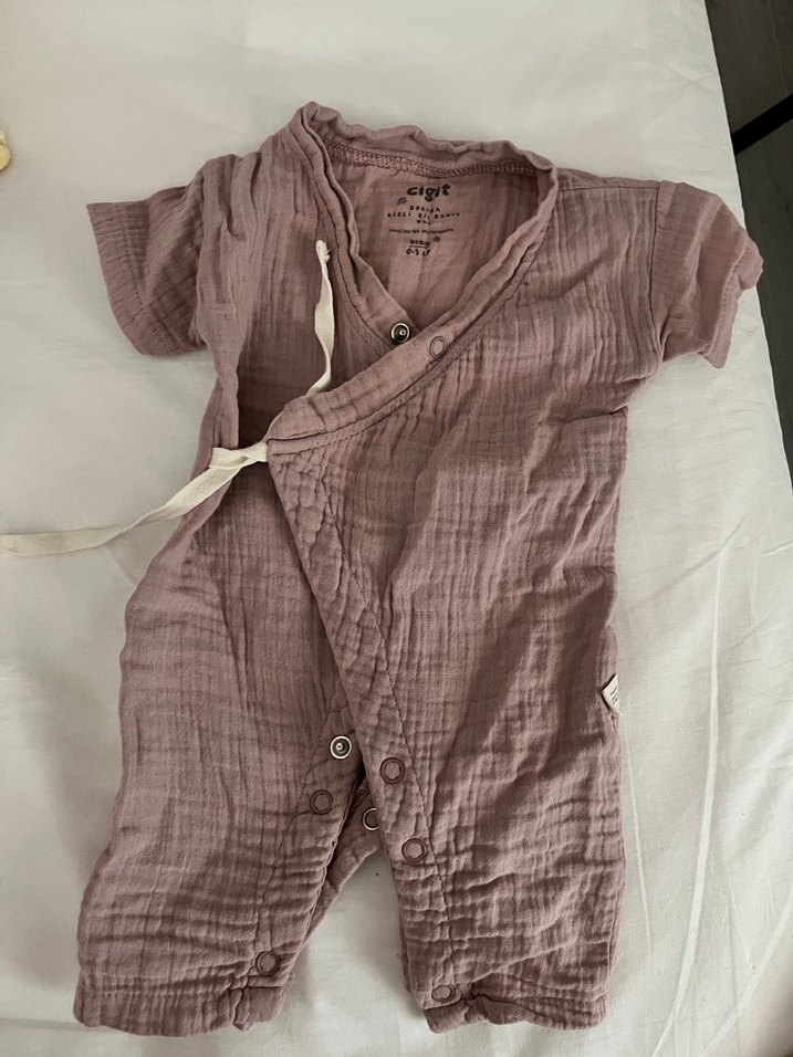 Yumuşak müslin kumaşlı pastel lila bebek kız tulumu, düğmeli kapama ve kısa kolludur. Desensiz ve rahat bir yapıya sahiptir.