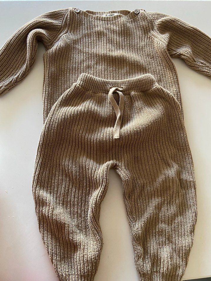 Kahverengi triko takımı, yuvarlak yaka ve uzun kolludur. Rahatlık için yumuşak örme kumaştan yapılmıştır. Pantolon, ayarlanabilir bağcıklı bele sahiptir. Sıcacık tutar.