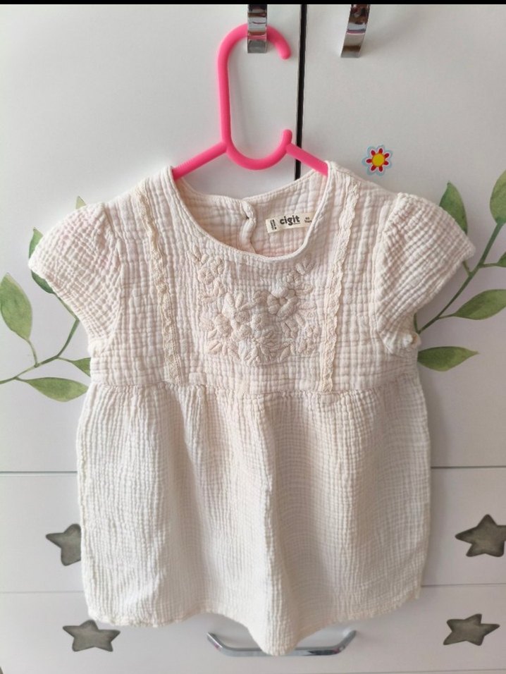 Kısa kollu, yuvarlak yakalı beyaz keten elbise, nakış ve dantel detaylıdır. Bohem tarzda, bol kesimdir. 4-5 Yaş