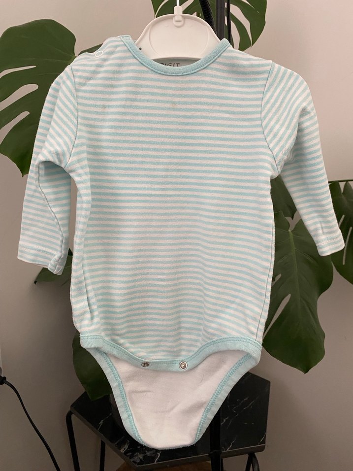 Pastel mavi renkli, uzun kollu, yuvarlak yakalı ve düğmeli bebek body. Yumuşak çizgili deseni ve rahat kesimi vardır.