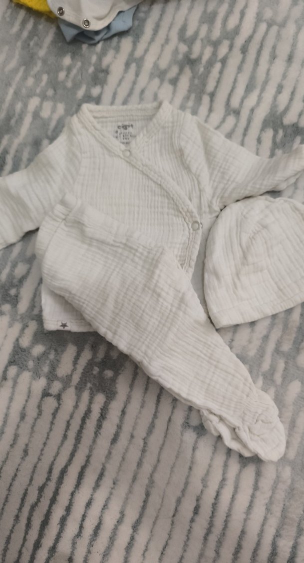 şapka eldiven önlük hepsi duruyor bir iki defa kullandık yepyeni Yumuşak keten kumaştan yapılmış, düğmeli uzun kollu bebek erkek hastane kıyafeti. Beyaz ve bohem tarzda, desensiz tasarıma sahip. Şapka ile birlikte gelir.