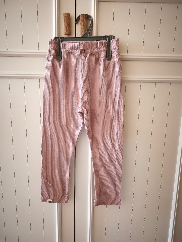 Kız çocukları için pileli, keten kumaştan yapılmış, pastel pembe renkte, sade ve temel normcore tarzda tayt.