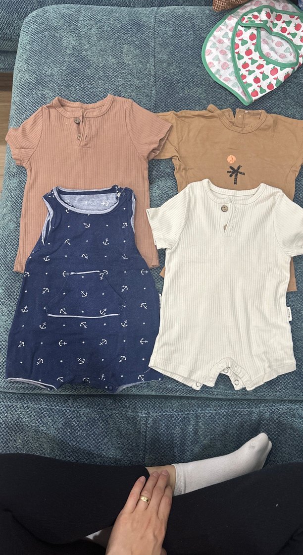 Pamuklu, kısa kollu, yuvarlak yaka bebek takımı pastel kahverengi tonlarında. Lacivert denizci desenli tulum içerir.