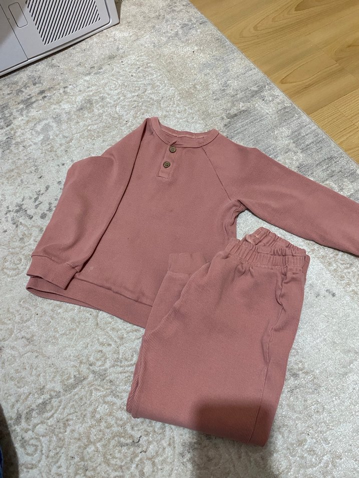 Uzun kollu, düğmeli bebek kız takımı, pastel pembe renkte, desensiz. Rahat üst ve lastikli pantolon içerir.