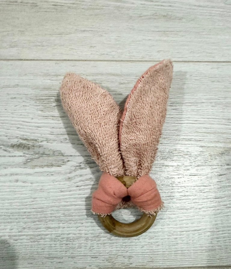 Yumuşak havlu kumaştan tavşan kulaklı, pembe, ahşap halka tutacaklı diş kaşıyıcı oyuncak.