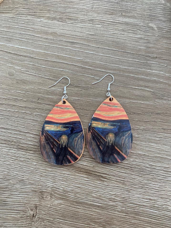 Uzun, çok renkli, The Scream tablosundan esinlenen baskılı tasarıma sahip bohem tarzda küpeler. Boncuk detaylı, romantik akşamlar için uygun.