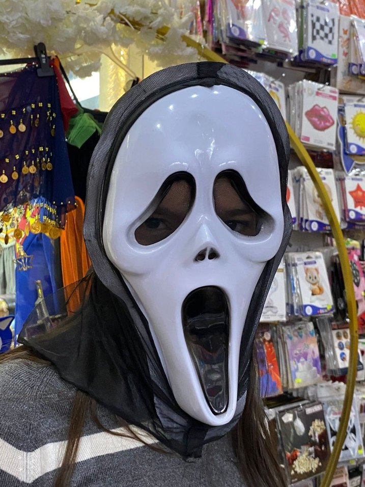 Beyaz renkte, renkli görünüme sahip, uzun ağız ve göz açıklıkları olan, tüm yüzü ve başı kaplayan hayalet maskesi.
