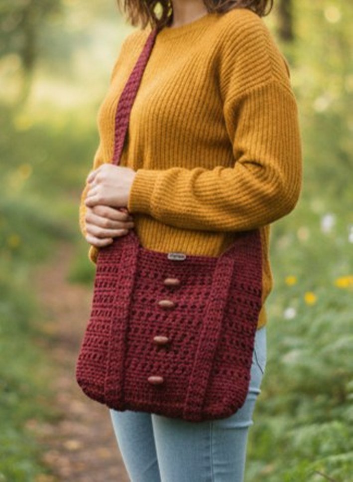 Bordo renkli, dantel detaylı ve ahşap düğmeli örgü kadın çantasıdır. Rahat ve bohem tarzıyla günlük kullanıma uygundur. boy 25 en 29 cm. astarsız
