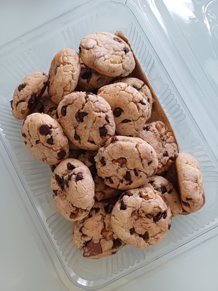 Şeffaf plastik kutuda sunulan, yumuşak ve gevrek dokulu çikolatalı cevizli kurabiye paketi. Taze yapılıp gönderilir kilosu