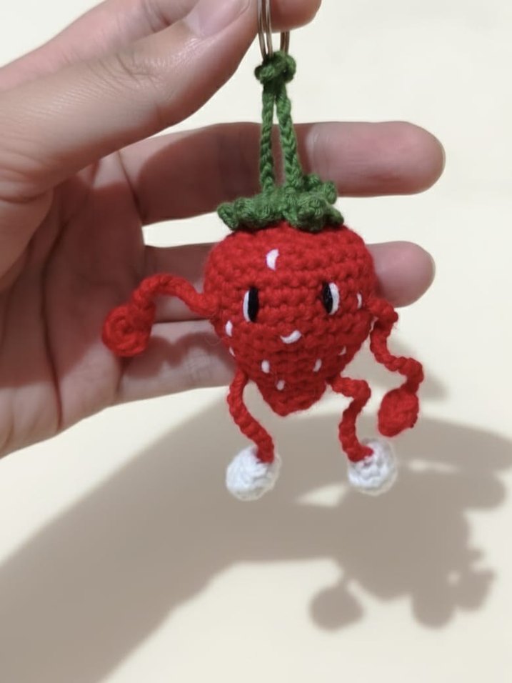 Renkli, örgü çilek anahtarlık; kırmızı gövde, yeşil üst ve beyaz detaylarla sıcak ve bohem tarz için uygun.