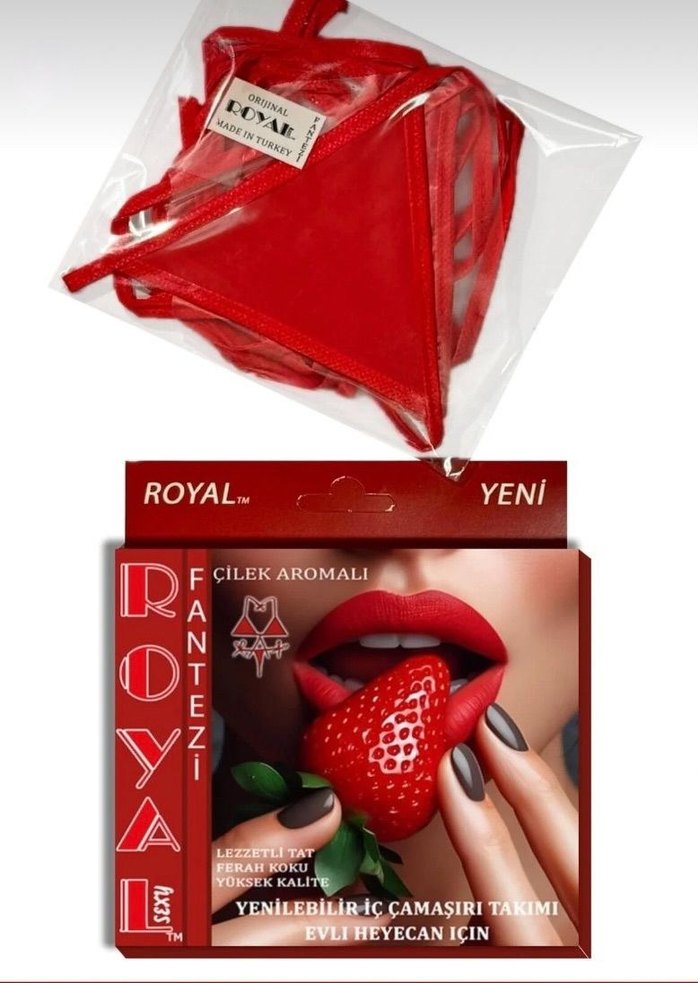 Canlı kırmızı renkte, çilek aromalı Paketinde yenilebilir iç çamaşırı takımı bulunur, özel anlar için tasarlanmıştır. Royal markasıdır.