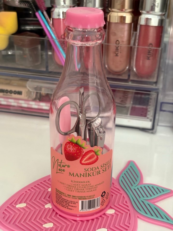 Çilek aromalı, soda şişesi şeklinde tasarlanmış manikür setidir. İçinde tırnak makası, tırnak törpüsü ve manikür aletleri bulunur.