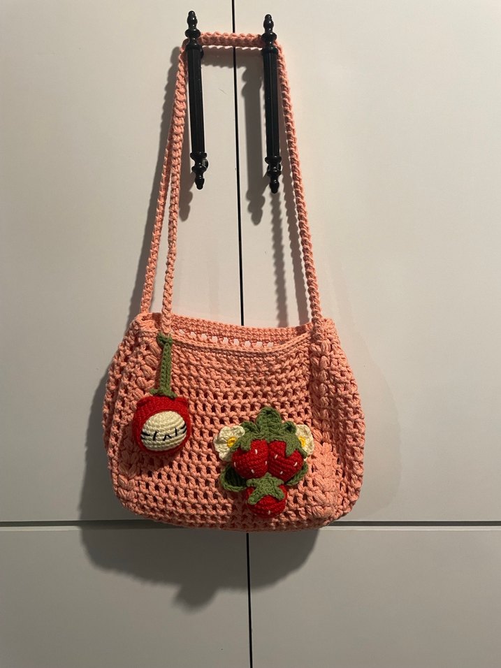 El emeğiyle özenle örülmüş, tatlı çilek detaylarıyla süslenmiş bu çanta günlük kombinlerinize yumuşak ve sıcak bir dokunuş katar. Hafif yapısı sayesinde rahatça taşınır, örgü dokusu sayesinde hem şık hem de doğal bir görünüm sunar. • %100 el yapımı • Yumuşak dokulu ip • Günlük kullanıma uygun Farklı renk seçenekleri için lütfen iletişime geçiniz