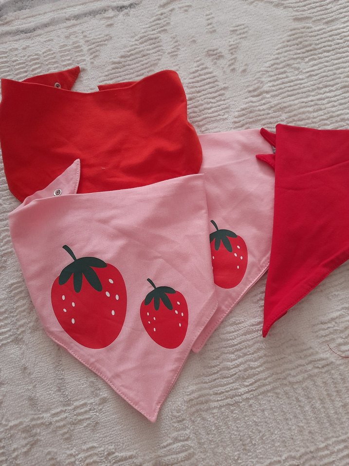 Yumuşak kumaştan, çıtçıtlı, renkli çilek baskılı kırmızı bebek önlüğü.