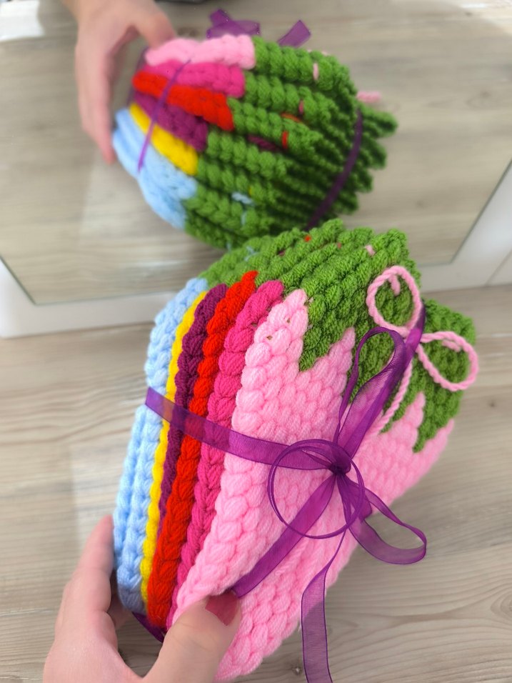 Çok renkli, yumuşak dokulu banyo süngerleri seti, mor kurdele ile bağlanmış ve kullanımı kolaydır.
