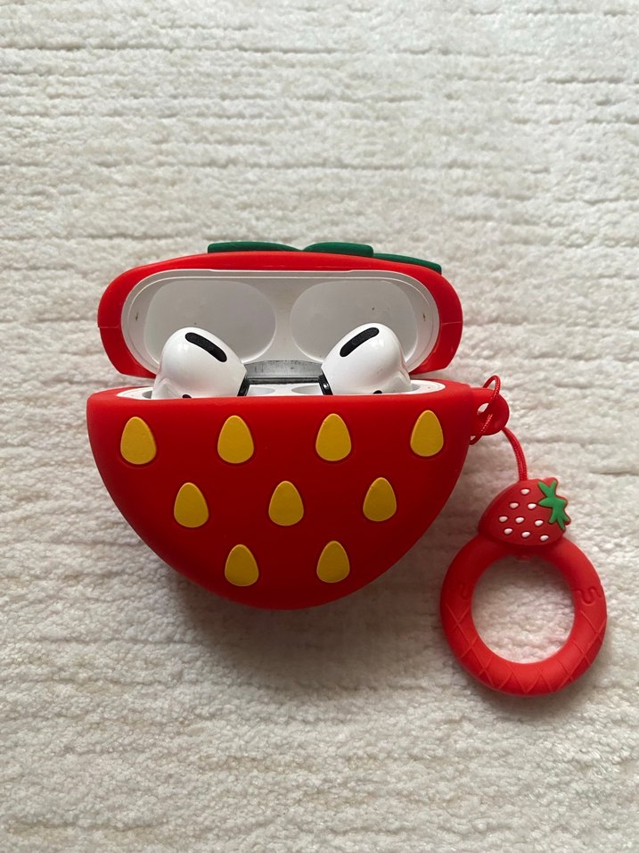 Airpods Pro Uyumlu. Kırmızı, çilek şeklinde kablosuz kulaklık kılıfı, sarı tohum detayları ve uyumlu anahtarlık halkası ile.