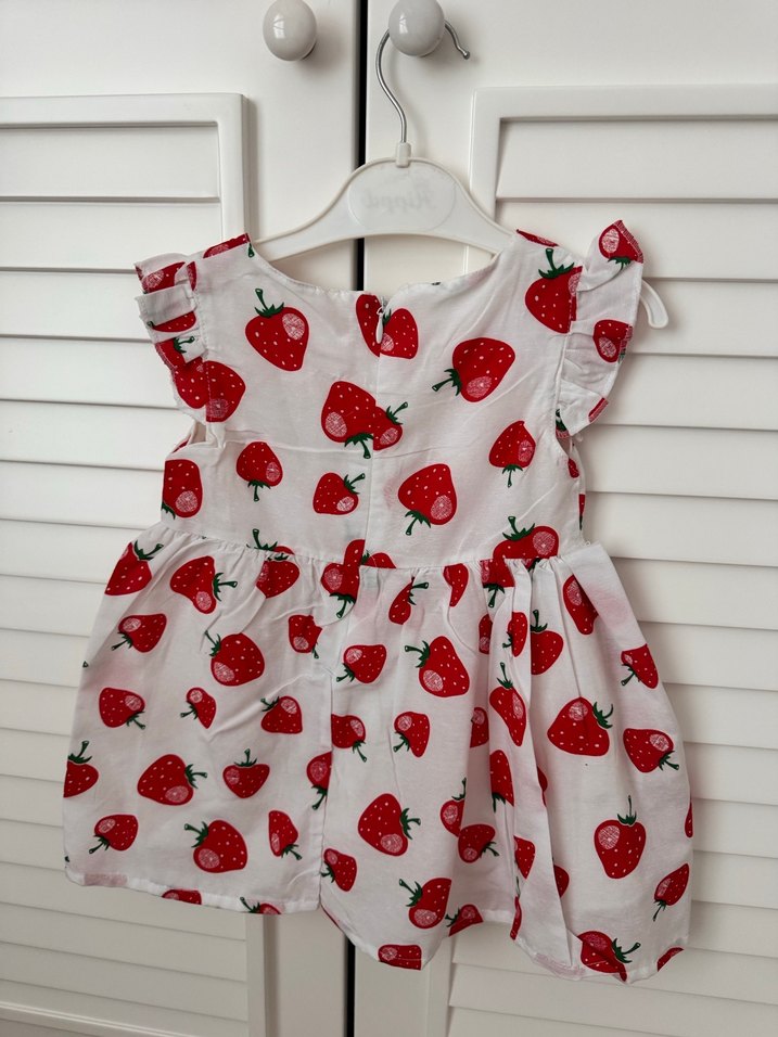 Kolsuz, çilek desenli kız elbisesi. Yumuşak sentetik kumaştan, bol kesim ve fırfırlı detaylara sahip.