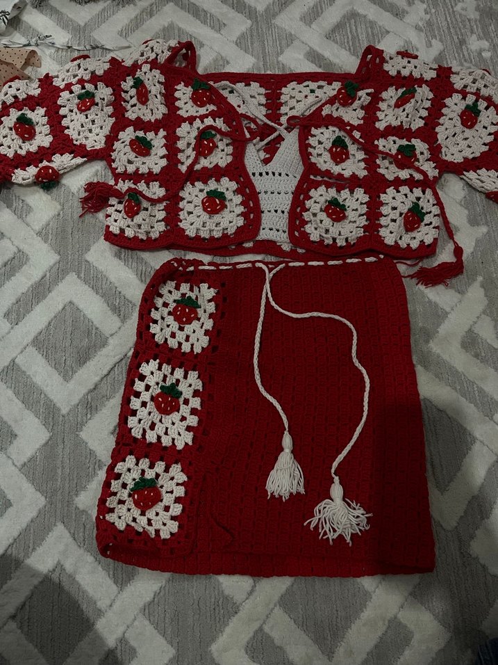 Renkli nakışlı desenlere sahip, askılı kollu el örgüsü plaj takımı