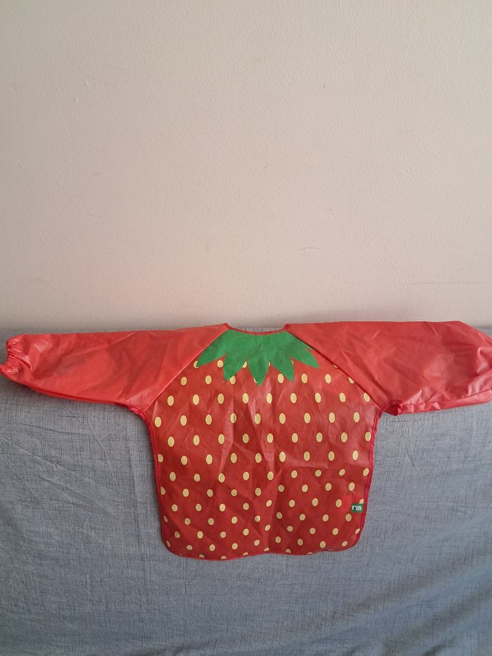 Uzun kollu, renkli çilek desenli bebek önlüğü, yemek sırasında kıyafetleri korur.