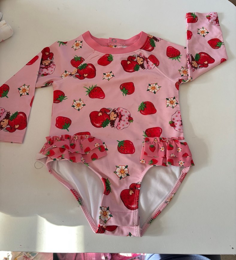 Lekeli yerleri var o yüzden düşük fiyat.Renkli pembe, uzun kollu kız mayosu, çilek desenli ve kalça kısmında fırfır detaylıdır. Plaj için uygundur.