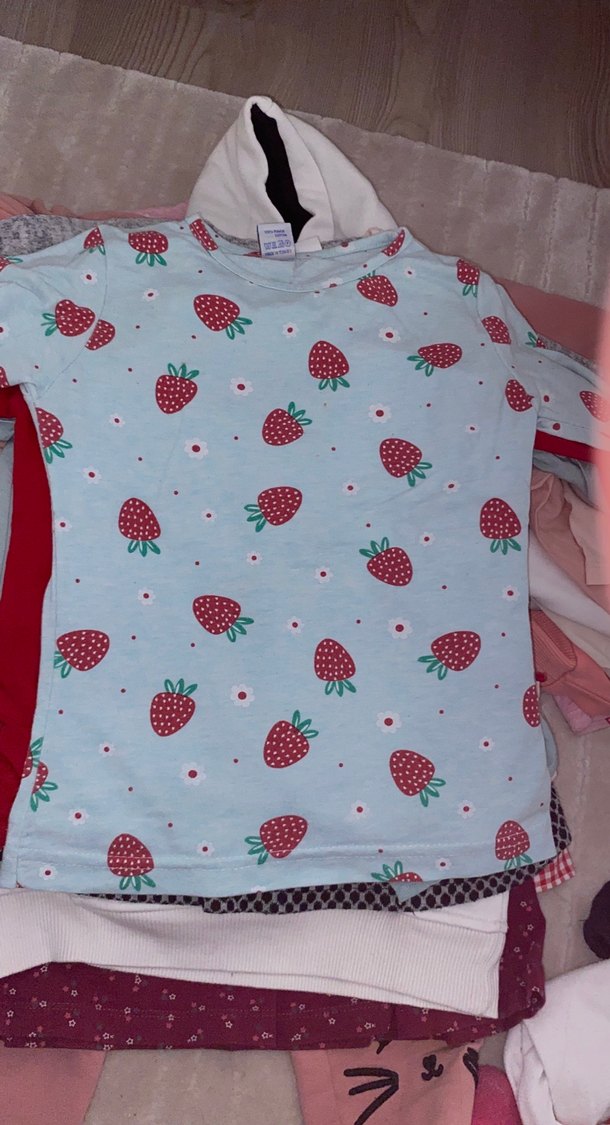 Dar kesim, uzun kollu kız tişörtü, yuvarlak yaka ve renkli çilek desenlidir. Yumuşak sentetik kumaştan üretilmiş ve düğme detayları bulunur.