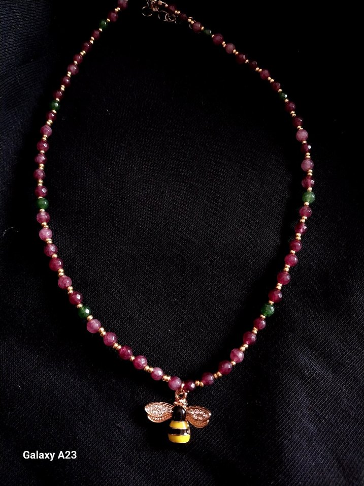 Doğaltaşlı, işlemeli desenli ve arı figürlü uçlu koyu renkli çok renkli boncuklu midi uzunlukta kolye.