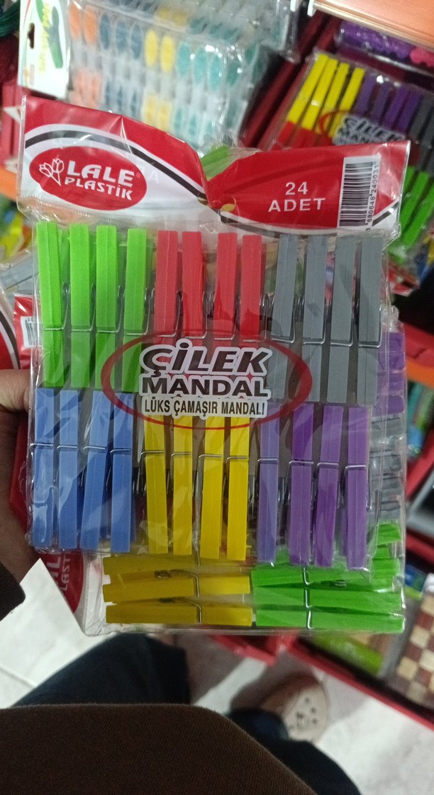 24 adet renkli, lüks çamaşır mandalı içeren paket. Yeşil, kırmızı, gri, mavi, sarı, mor gibi çeşitli renkler mevcuttur. bı paket fiyati