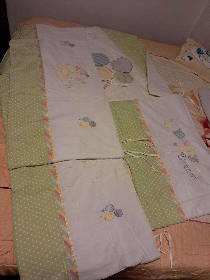 Nakışlı desenlere sahip pastel yeşil tekstil bebek uyku seti, çocuklar için yumuşak ve rahat bir uyku ortamı sunar. ürün çilek mobilya büyüyen büyüyen beşiğe ait olup. yatak koruyucuları 2 yan parmaklıklarda yer alan örtüler ve bir tane başucunda yer alan örtü içerir ayrıca bir tane bebek yorganı vardır alıcısına Bir tane de beyaz lastikli çarşaf ile beraber göndereceğim hayırlı olsun. kusur yoktur sadece yorganda biraz leke mevcut bir de bebek asıldığı zaman bazı yerlerinde ip askılarında kopma olmuştu onları elimle dikmiştim
